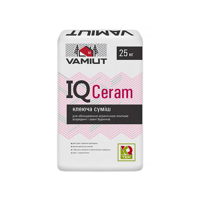 Суміш Vamiut IQ Ceram призначена для облицювання бетонних, цегляних, цементно-піщаних і цементно-вапняних поверхонь плиткою з водопоглинанням більше 1% (плитки з кераміки, фаянсу і т. п.) та розміром не більше 40х40 см. Суміш Vamiut IQ Ceram застосовується по міцним основам, що не деформуються, на поверхні стін та підлог всередині і зовні будівель в цивільному та промисловому будівництві.