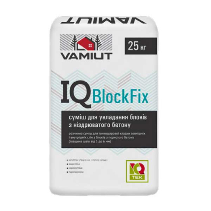 Суміш Vamiut IQ BlockFix застосовується для зведення внутрішніх і зовнішніх стін з точних за розміром блоків з ніздрюватого бетону (газобетон, пінобетон). Завдяки високій адгезії до основи забезпечує монолітність зведених конструкцій.